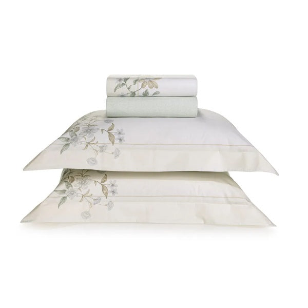 O Jogo de Cama Casal Karsten Adélia vem com a estampa, com traços botânicos desenhados em tons suaves de verde e bege, evoca a leveza e o frescor da natureza, criando um ambiente sereno e convidativo no quarto. O lençol com elástico com fundo branco e estampa sútil em tom claro de verde, o sobre lençol com vira dimensionada e bainha de 10cm traz um toque extra de elegância, complementado pelo design floral sutil e refinado. A estampa, com traços botânicos desenhados em tons suaves de verde e bege, evoca a leveza e o frescor da natureza, criando um ambiente sereno. As fronhas também seguem o mesmo padrão, com abas de 7cm que proporcionam um acabamento perfeito, envolvendo os travesseiros com charme e estilo.